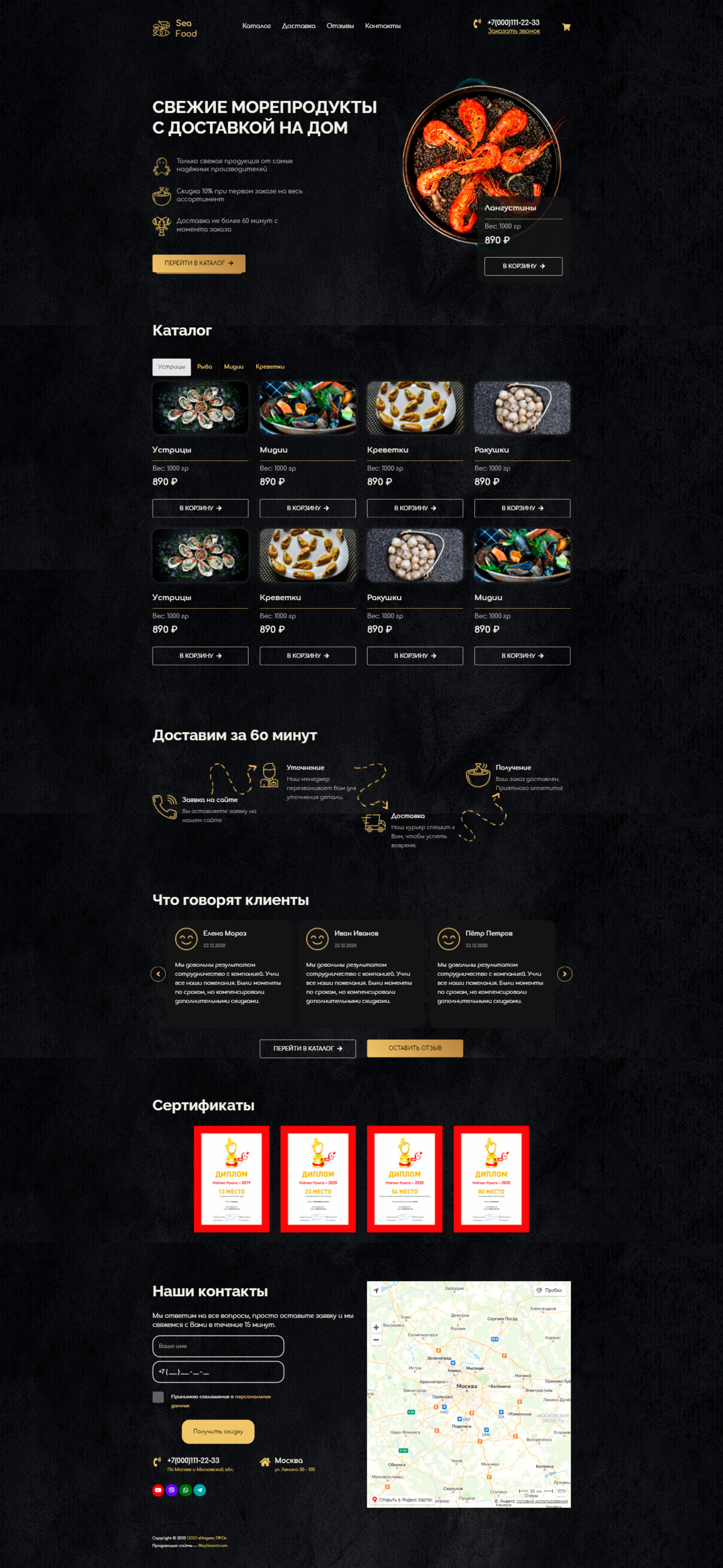 - Промоблок "Свежие морепродукты" с кнопкой призыва к действию "Перейти в каталог"